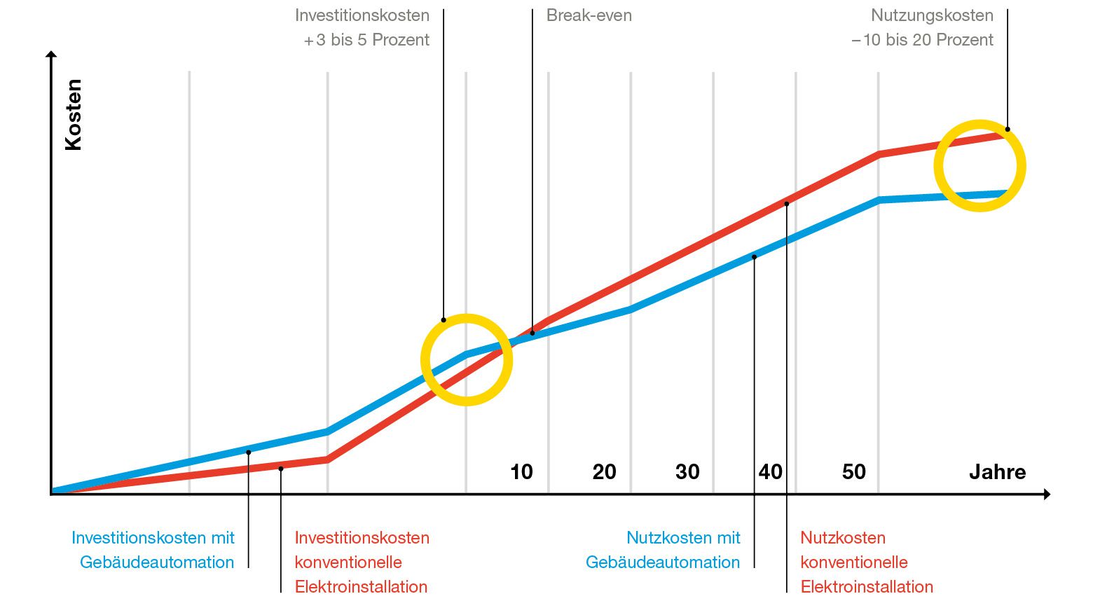 Nun ist es natürlich interessant zu wissen, wie lange es geht, bis eine Gebäudeautomation amortisiert ist. Und diesbezüglich sind die Zahlen äusserst verlässlich aufgrund der Tatsache, dass die Amortisationszeiten trotz unterschiedlicher Ausbaumöglichkeiten nicht erheblich voneinander abweichen. Denn je umfangreicher die Gebäudeautomation ausfällt, desto grösser ist tendenziell auch das Sparpotenzial. Deshalb dient das in der Grafik aufgezeigte Beispiel anhand des Freizeit- und Einkaufszentrums «Sihlcity» in Zürich durchaus als allgemeine Referenz. Und daran ist zu erkennen, dass die 3 bis 5 Prozent an Mehrinvestitionen bei der Erstellung des Baus bereits innerhalb von weniger als 10 Jahren amortisiert sind. Auf die gesamte Nutzungsdauer eines Gebäudes bezogen, dauert es folglich relativ kurz, bis sich die Automation auszahlt.