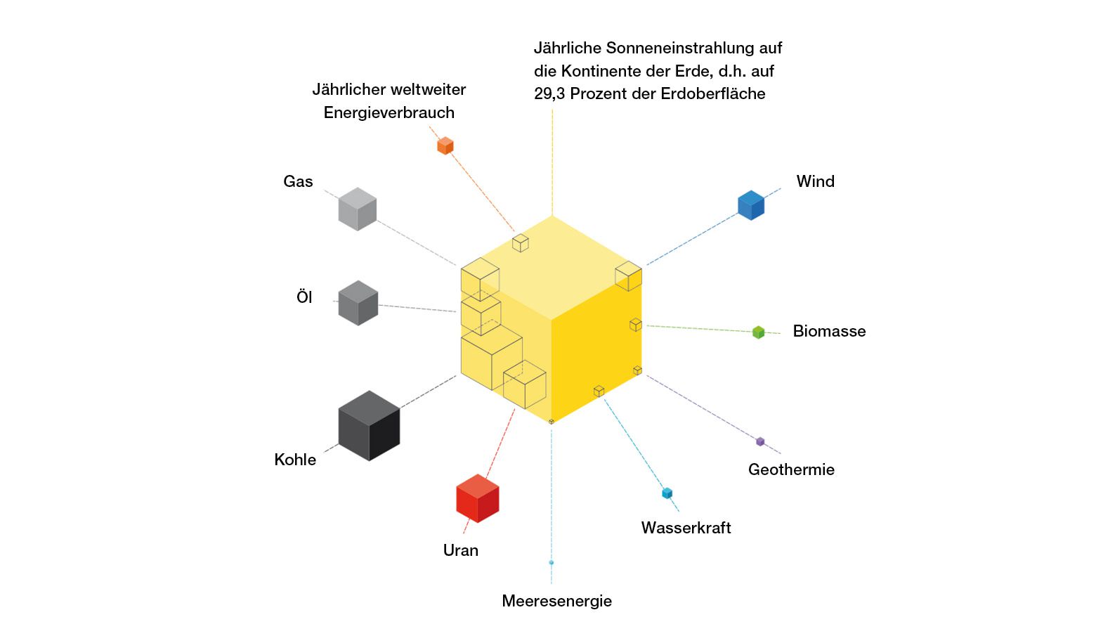 Auf der Grafik sind für die fossilen und nuklearen Energien die gesamten Reserven angegeben, bei den erneuerbaren Energien die jährlichen Potenziale.