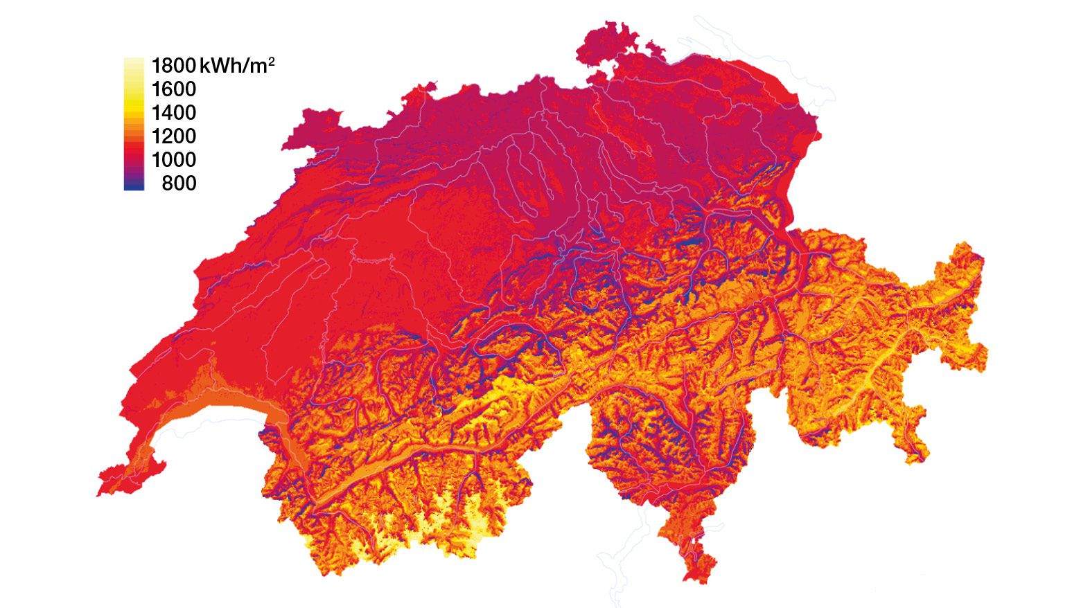 Diese Sonnenkarte zeigt, dass die Schweiz bezüglich der Einstrahlung ausgezeichnete Bedingungen für das Betreiben von Photovoltaikanlagen bietet.
