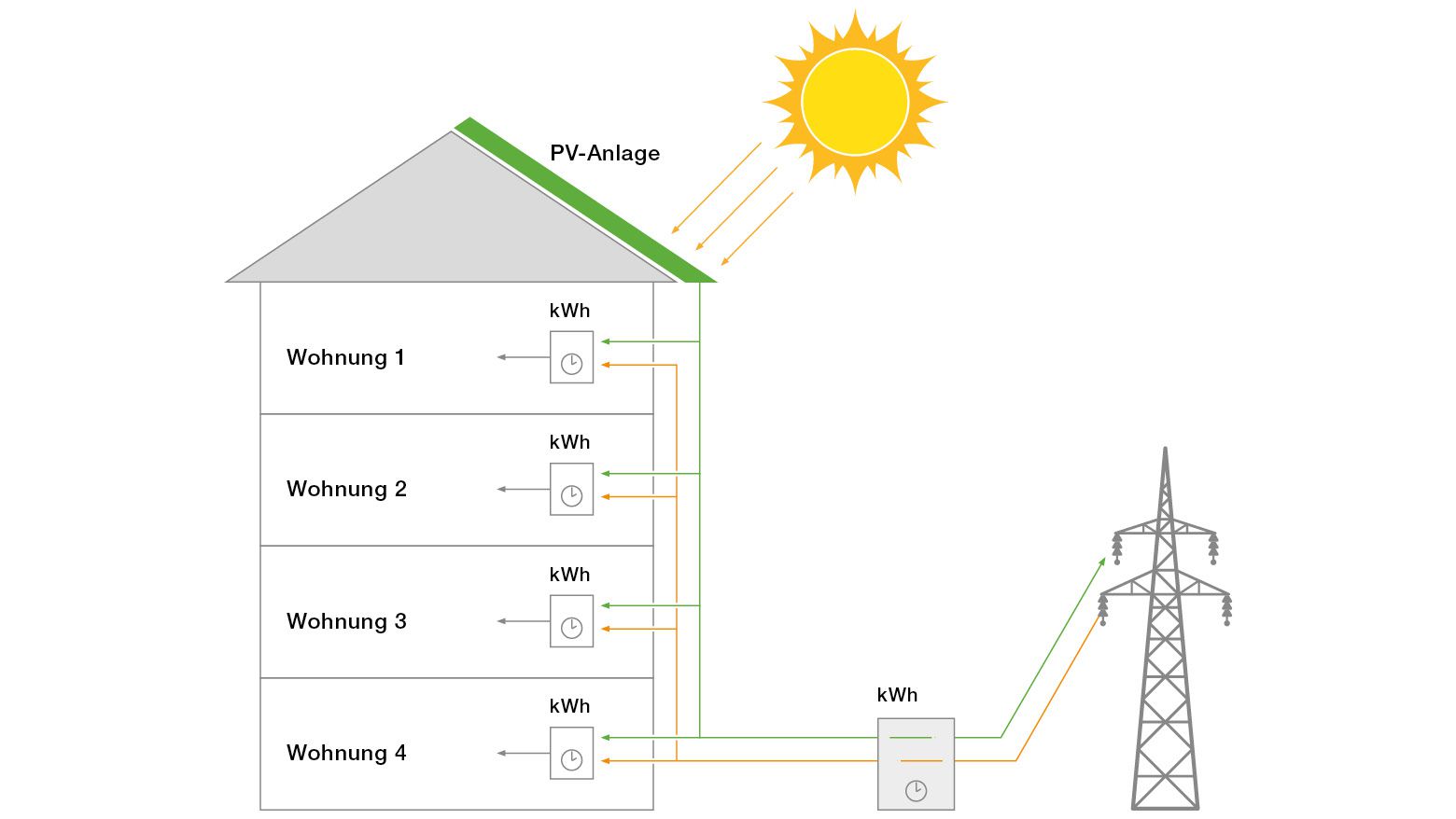 Die Grafik zeigt ein Mehrfamilienhaus mit Eigenverbrauchsgemeinschaft. Falls kein Solarstrom (grün) zur Verfügung steht, wird Strom aus dem Netz bezogen, überflüssiger Solarstrom wird ins Netz eingespeist. Das Mehrfamilienhaus selbst stellt sich so aus Sicht des Netzbetreibers als ein grosser Verbraucher dar.