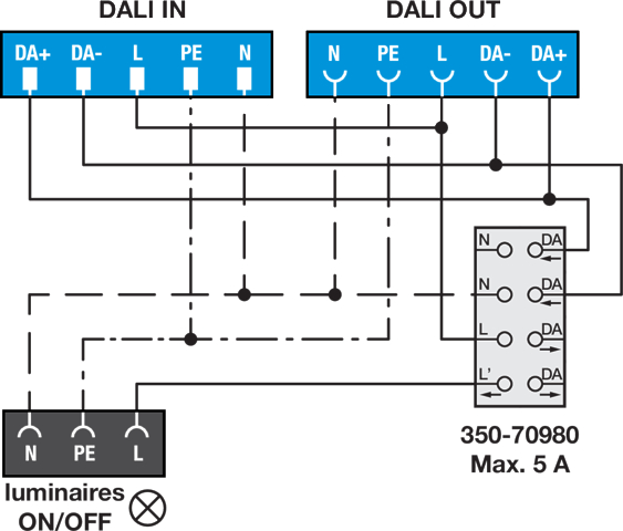 Verteilerbox Niko WAGO WINSTA, ermöglicht die Steuerung von nicht dimmbaren Leuchten die extern an den DALI-Bus angeschlossen sind, kann in Kombination mit den Verteilerdosen 353 70801, 353 70802 und 353 70803 oder in Verbindung mit einem DALI 2-BMS-System verwendet werden, externer Anschluss für nicht dimmbare 230 V-Leuchten, schwarz