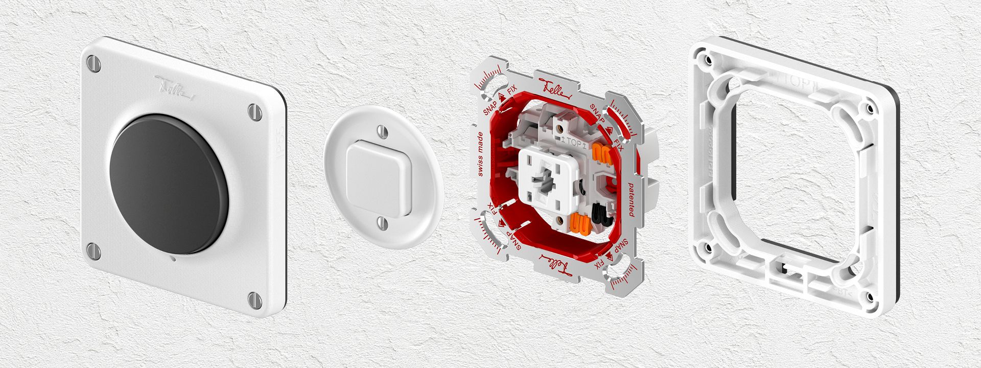Für die SNAPFIX®-Kompatibilität der NEVO-Montagerahmen von Feller wurde das Innenleben angepasst, die Moosgummidichtungen von ELEMENT übernommen und das Entwässerungskonzept verbessert. Auch der 20-mm-Zwischenrahmen ist nun SNAPFIX®- tauglich und bietet dank neuem Ausschnitt mehr Platz für Dreh- und Schlüsselschalter. Ein neuer SNAPFIX®-kompatibler 8,5-mm-Zwischenrahmen gleicht die Höhendifferenz zwischen IP55-Steckdosen und anderen Apparaten aus. Die Kombinationsplatten mit grösserem Durchmesser sind ebenfalls SNAPFIX®-tauglich und neu in den Varianten 1×1, 2×1 und 3×1 erhältlich. Die optimierte Abdichtung sichert weiterhin die IP55-Schutzklasse.