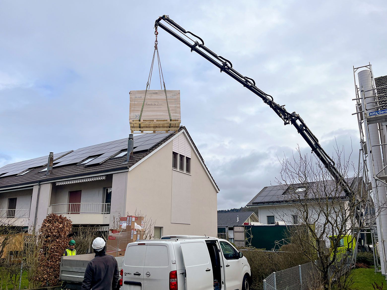 Otto Fischer und Käppeli Logistik AG bei der Auslieferung eines Projektes direkt auf’s Dach.