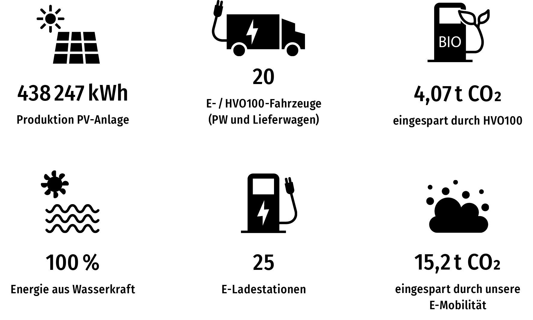 Mit unablässigem Engagement arbeiten wir daran, den ökologischen Fussabdruck unseres Unternehmens immer weiter zu verbessern. So haben wir schon 2014 damit begonnen, unsere Firmenflotte nach und nach mit Elektrofahrzeugen auszustatten. Darüber hinaus wird die Hälfte unseres Strombedarfs über unsere firmeneigene Solaranlage auf dem Dach gedeckt, während die andere Hälfte aus erneuerbarer Wasserkraft stammt. Seit Neuestem betreiben wir zudem 5 Fahrzeuge unseres Fuhrparks mit HVO100. Dieser erneuerbare, pflanzliche Kraftstoff verursacht 90 % weniger Treibhausgase als Diesel. Dadurch konnten wir 2025 bereits 4.07 Tonnen CO₂ einsparen.