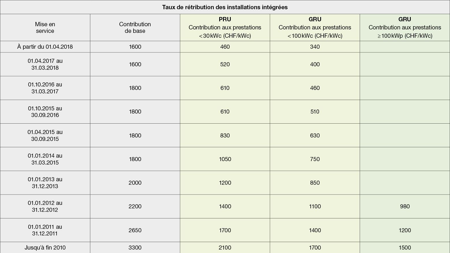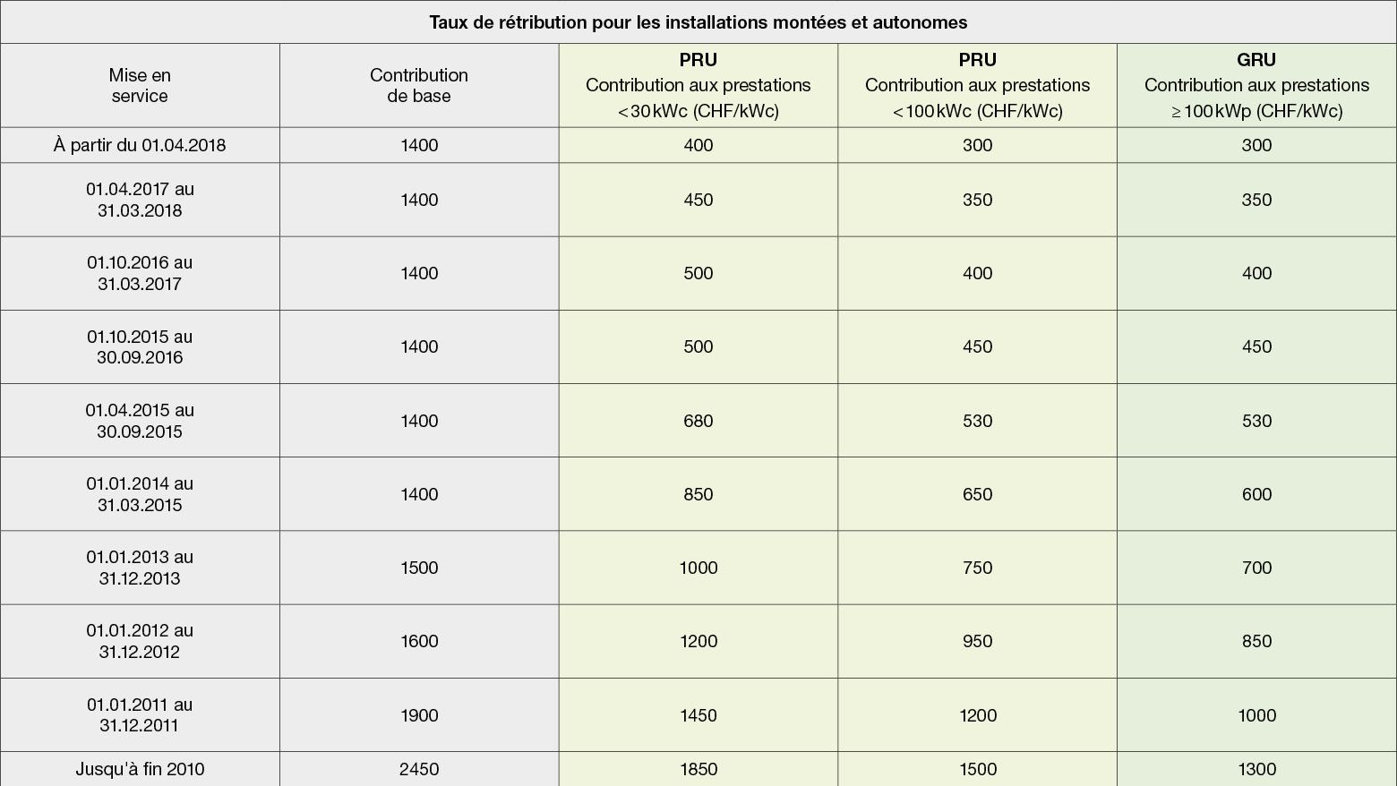 En raison des dispositions légales, les exploitants d’installations photovoltaïques d’une puissance de 2 Kilowatt crête (kWc) à 100 Kilowatt crête disposent d’une «rétribution unique pour les petites installations PV (PRU)». Ceux qui exploitent une plus grande installation PV générant 100 Kilowatt crête ou plus, ont droit à la rétribution unique pour grandes installations photovoltaïques (GRU). Le point commun des deux classes de rétribution (PRU et GRU) est qu’il s’agit d’une rétribution unique, c’est-à-dire d’aides à l’investissement uniques couvrant environ 30 pour cent des coûts d’investissement d’une installation de référence correspondante. De manière simple, cela signifie que: