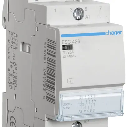 Contattore AMD Hager, tensione di azionamento nominale 230 V, tipo di tensione di azionamento AC, numero di contatti di chiusura 0, numero di contatti di riposo 4, corrente d’esercizio nominale 25 A, larghezza in unità di suddivisione 2