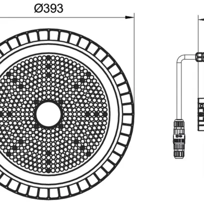Proiettore capannone LED Philips CoreLine BY122P, classe di protezione I, grado di protezione IP65, tipo di tensione AC, tensione nominale 220…240 V, apparecchio di servizio apparecchio di servizio LED comandato da corrente, senza funzione di regolazione, corpo luminoso LED non sostituibile, potenza max. del sistema 157 W, flusso luminoso effettivo secondo IEC 62722-2-1 25000 lm, colore della luce bianco, temperatura di colore 6500 K, grado di resa del colore 80-89, diffusore di luce lente focalizzatrice, ripartizione della luce simmetrico, angolo di irraggiamento a fascio estremamente largo >80°, modo di montaggio sospeso, materiale della scatola alluminio, colore della scatola grigio, test del filo incandescente secondo IEC 60695-2-11 650 °C - 30 sec., resistenza agli urti IK08, lunghezza 393 mm, diametro esterno 393 mm