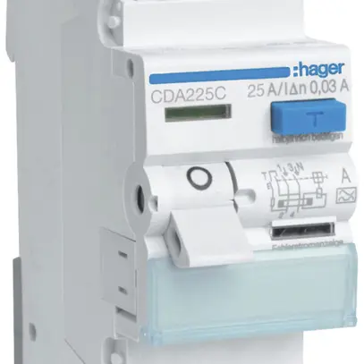 Fehlerstrom-Schutzschalter Hager RCCB (RCD), Polzahl 2, Bemessungsspannung 230 V, Bemessungsfehlerstrom 0.03 A, Fehlerstrom-Typ A, Bemessungsstrom 25 A, Kurzschlussfestigkeit (Icw) 6 kA, Breite in Teilungseinheiten 2
