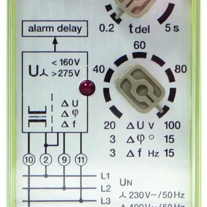 Surveillance de tension et de champ-tournant ComatReleco SSU 33L, 230 V AC, gamme de surveillance: 3LN, 280 V…480 V 50 Hz, raccordement à fiches 11L, puissance absorbée 3 VA, sans tension auxiliaire, boîtier en matière isolante, vert, réglage: temporisation d'alarme 0.2…5 s, sensibilité: asymétrie, angle de phase, fréquence, surveille: séquence de phase (champ-tournant), panne de phase, angle de phase, symétrie de tension, surtension, sous-tension, fréquence, déclenche aussi à tension de retour sur phase interrompue, T -25…60 °C