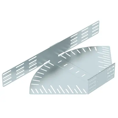 Gomito Bettermann RB W 140 FS, angolo regolabile, cambio di direzione orizzontale, forma costruttiva gomito articolato completo, tipo di arco arco liscio, altezza del canale portacavi 110 mm, larghezza del canale portacavi 400 mm, raggio interno 50 mm, spessore del materiale 1.25 mm, perforazione laterale, materiale acciaio, protezione della superfice zincato a nastro, foro per montaggio nel pavimento, temperatura di impiego -20…120 °C, colore zinco, per realizzare una diramazione orizzontale, pezzo stampato, per passerelle portacavi a innesto e avvitabili con una altezza laterale 110 mm, angolo regolabile 0…90°, montaggio senza viti con morsetti doppi oppure connessione a vite con viti a testa tonda FRS e dadi con rondelle M6, utilizzabile in ambienti interni
