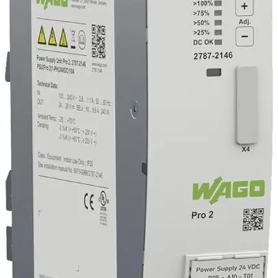 EB-Stromversorgung WAGO Pro 2, Bemessungsversorgungsspannung AC 50 Hz 90…264 V, 1. Ausgangsspannung 24…28 V, Ausgangsspannung geregelt, stabilisiert, Leistungsabgabe 240 W, max. Ausgangsstrom 1 10 A, Tragschienenmontage möglich, Ausführung des elektrischen Anschlusses Federzuganschluss, Schutzart IP20, Breite 50 mm, Höhe 130 mm, Tiefe 130 mm, einphasig, Verhalten bei Überlast: TopBoost, PowerBoost und zeitlich begrenzter Konstantstrommodus (weitere Überlastverhalten einstellbar). PowerBoost: DC 15 A (5 s), TopBoost: bis zu 600 %, LED zur Anzeige des Betriebszustandes (DC-OK), Kurzschlussfest, Leerlauffest, Parallelschaltbar, Reihenschaltbar, Schutzklasse I, Überspannungskategorie III (? 2000 m) und II (> 2000 m), Verschmutzungsgrad 2