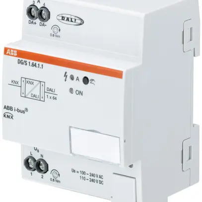 Gateway KNX/DALI AMD ABB DG/S 1.64.1.1, pour le pilotage de max. 1× 64 participants DALI via bus KNX, commande par participant ou groupe (16), broadcast ou scènes (16), fonctions esclave / éclairage cage d'escalier/ forçage / blocage, supporte les tests de fonctionnement à déclenchement KNX pour luminaires de secours avec convertisseurs selon EN 62386-202, alimentation pour bus DALI intégrée