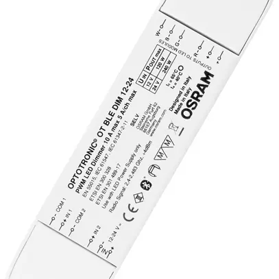 Convertisseur LED Osram OT BLE DIM, tensions de sortie 12 V et 24 V (raccordement par bornes à vis), pour la gradation sans fils des modules LED (blanc, Tunable White, RGB et RGBW), avec module radio Casambi pour la commande sans fils via un appareil Android/iOS (Bluetooth™ Low Energy), raccordement de boutons poussoir par contacts libres de potentiel, température ambiante -20…45 °C, humidité relative 5…85%, durée de vie 50 000 heures, 200 g, normes valables: EN 55015, EN 61547, EN 61347-2-11, ETSI EN 300 328, ETSI EN 301 489-17