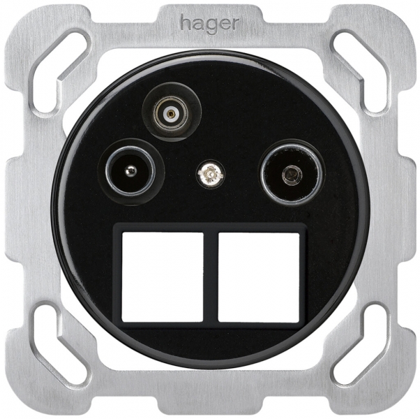 Prise d'antenne ENC Hager HMS basico, TV-R-Données, 2×IEC, 1×MiniDat, avec découpe pour 2×RJ45, gamme de fréquence canal de retour 5…65 Mhz, plaque de fixation 77×77 mm, disque frontal pour alésage Ø 58 mm, en Duroplast, noir