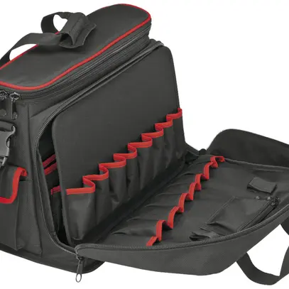 Borsa per utensili KNIPEX "Service", tasca interna imbottita per notebook e documenti DIN A4, in più 1 scomparto DIN A4 con cerniera, tasca anteriore apribile a 90° con 8 tasche per utensili e 1 taschino interno, retro della tasca anteriore dotata di 5 tasche per utensili e 3 scomparti porta penna, 1 pannello per utensili estraibile con 8 tasche sul lato anteriore e 2 file di asole elastiche sul retro, fondo protetto contro gli spruzzi d’acqua, cinghia tracolla regolabile con chiusura rapida, con due cinghie di trasporto, in tessuto poliestere altamente resistente, 2750 g