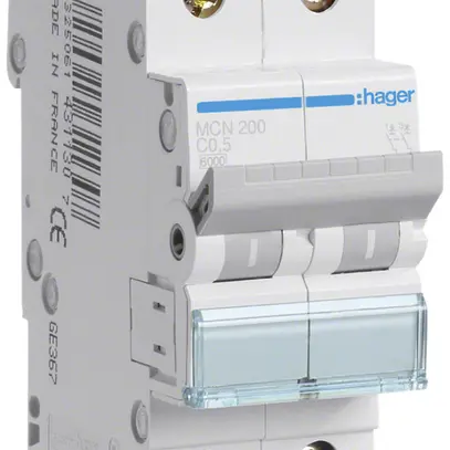 Disgiuntore Hager MCN, numero di poli (totale) 2, tensione nominale 415 V, caratteristica di intervento C, corrente nominale 0.5 A, potere di interruzione nominale Icn secondo EN 60898 a 230 V 6 kA, larghezza in unità di suddivisione 2