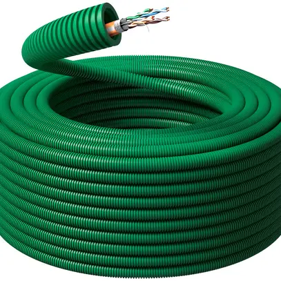 Tubo d'installazione precablato KRFWG PM FLEX, con cavi di trasmissione dati S/FTP CAT 7, marcatura metrica, 1000 N, classificazione 3432, resistente alla fiamma, autoestinguente, EN 61386.1, EN 61386.22, IK: EN 62262, bobina da 100 m