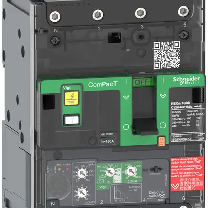 Disgiuntore di potenza Schneider Electric ComPacT NSXm 100B, con modulo di sgancio elettronico MicroLogic 4.1 Vigi (4P, corrente nominale ≤ 25 A), con protezione di corrente differenziale, ICU 25 kA @ 415 V AC, sistema di raccordo a vite EverLink, conforme a EN/IEC 60947, 144×108×80 mm