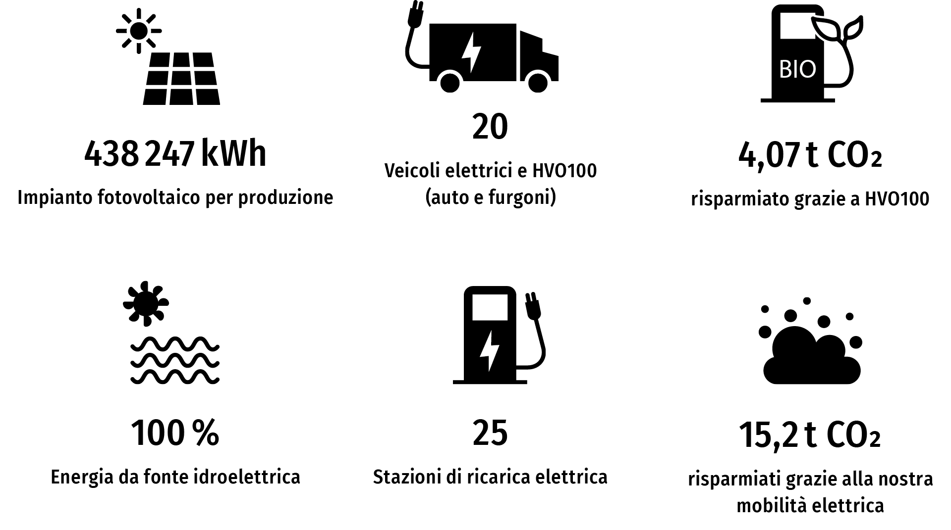 Lavoriamo con impegno costante per migliorare continuamente l'impronta ecologica della nostra azienda. Nel 2014, ad esempio, abbiamo iniziato a dotare la nostra flotta aziendale di veicoli elettrici. Inoltre, metà del nostro fabbisogno elettrico è coperto dall'impianto solare di proprietà sul tetto, mentre l'altra metà proviene da energia idroelettrica rinnovabile. Di recente abbiamo anche iniziato a far funzionare 5 veicoli della nostra flotta con l'HVO100, un carburante rinnovabile a base vegetale che produce il 90 % in meno di gas serra rispetto al diesel. Questo ci ha già permesso di risparmiare 4,07 tonnellate di CO₂ nel 2025