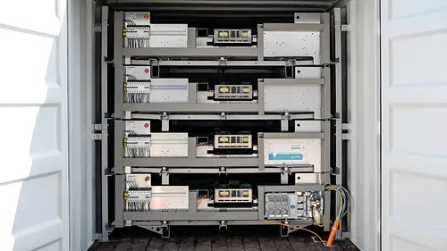 La vita interiore del «cubo di potenza». Le batterie delle auto elettriche riutilizzate sono chiaramente visibili.