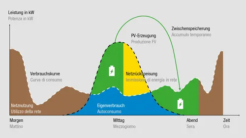 Con l'aiuto di un sistema di accumulo a batteria è possibile aumentare l'autoconsumo e ridurre al minimo il picco di potenza.