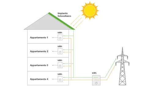 Il grafico illustra una casa plurifamiliare che condivide il consumo proprio. Se non è disponibile energia solare (verde), la corrente viene prelevata dalla rete; viceversa, l’energia solare in surplus viene immessa nella rete. La casa plurifamiliare stessa si presenta dal punto di vista di un gestore di rete come un grande consumatore.