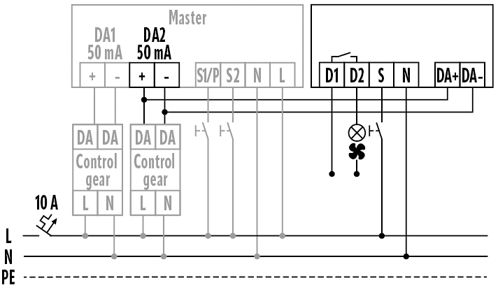 Modulo di commutazione ESYLUX SW DALI Full Automation, automatico o semiautomatico, ingresso a pulsante per commutazione manuale, relè a potenziale zero con capacità di commutazione di 10 A