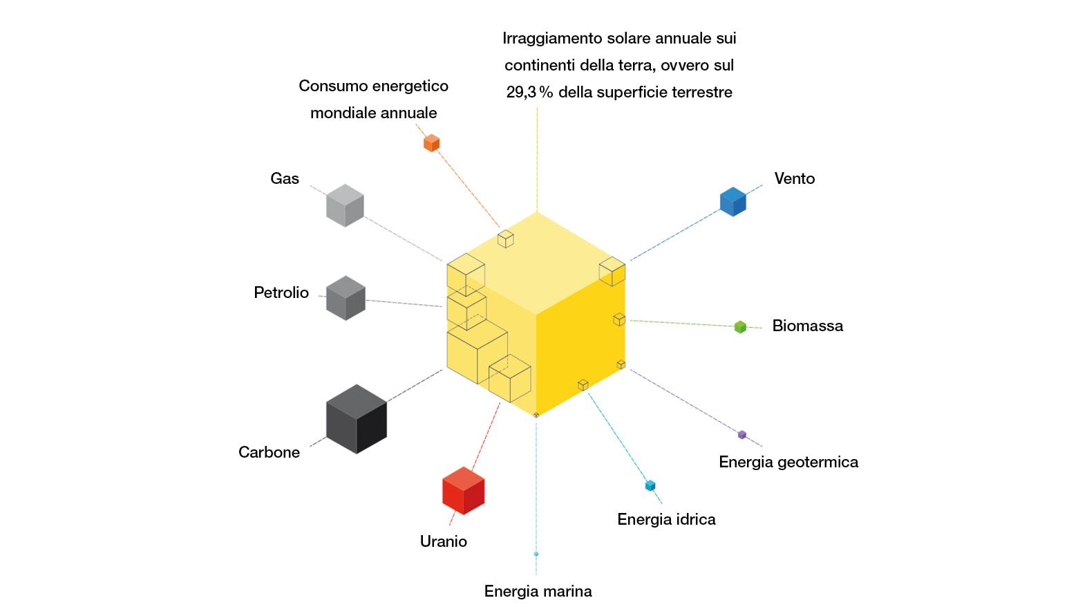 Il sole supera di gran lunga tutte le altre fonti energetiche. L’energia che irradia sulla Terra in un’ora soltanto copre il fabbisogno di tutta la popolazione mondiale per un anno intero. In altre parole, basta solo l’uno per cento di energia solare per fornire energia elettrica alla Terra per un anno.