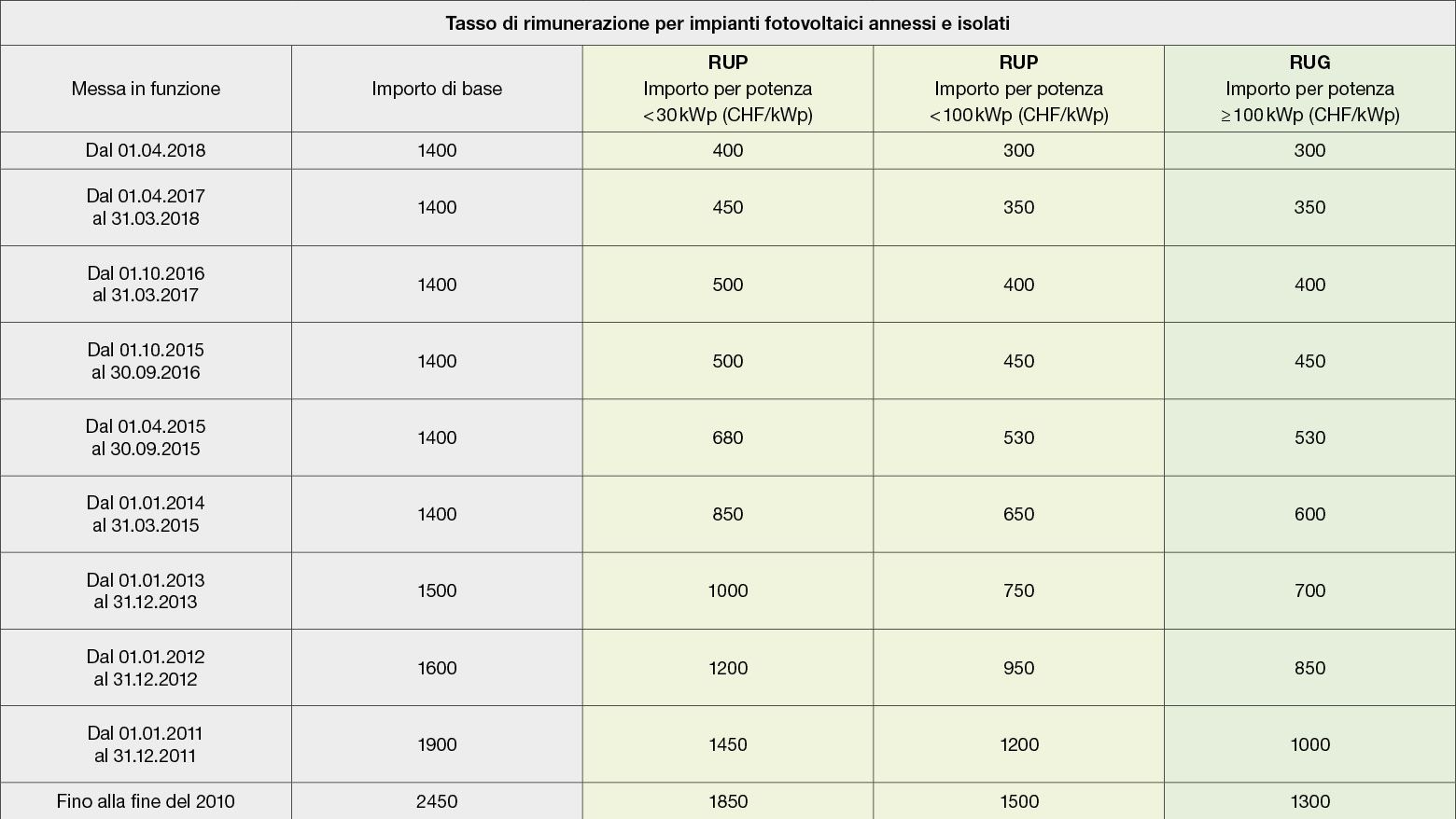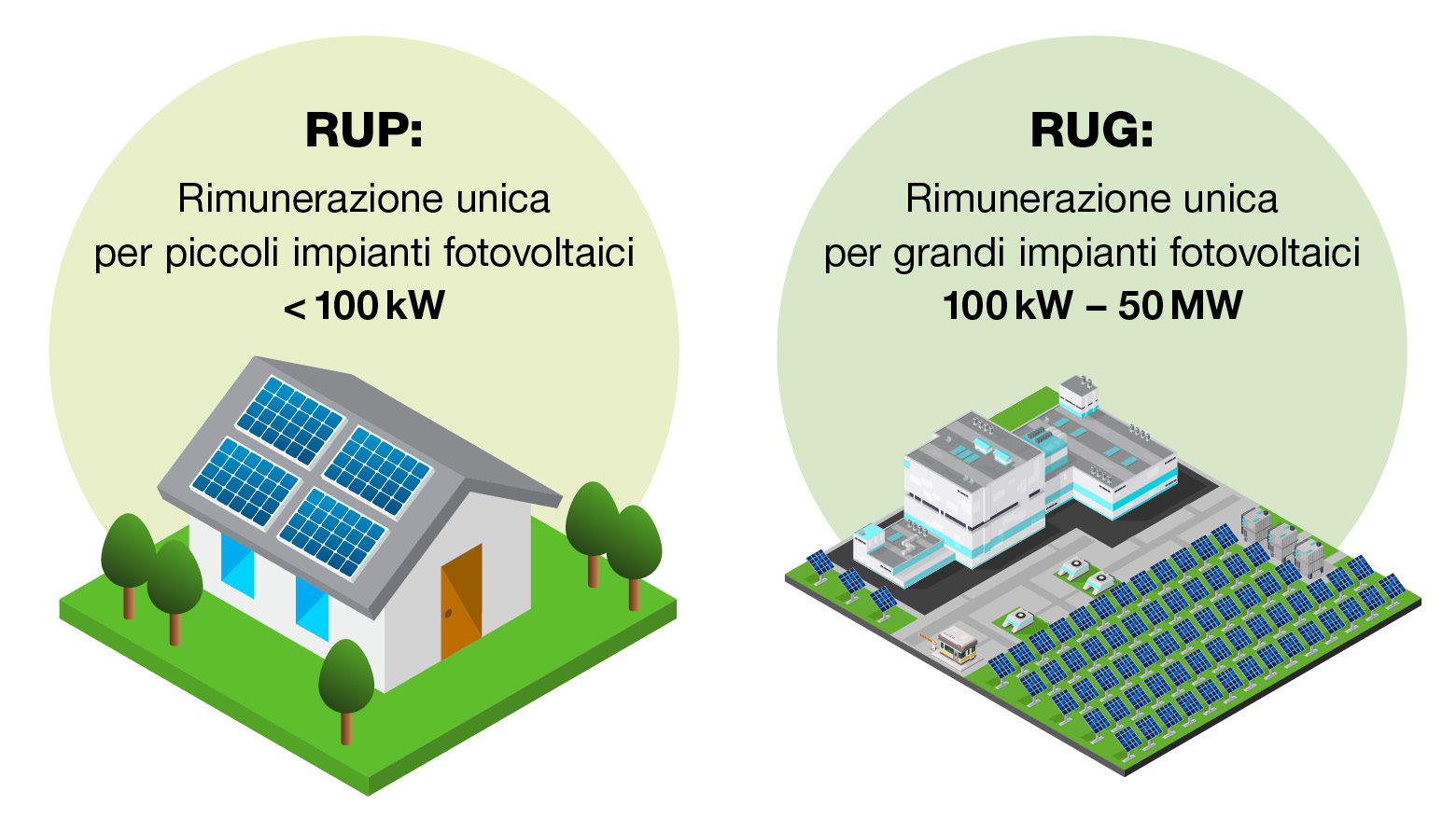 Sulla base delle disposizioni legali, ai gestori di impianti fotovoltaici con una potenza compresa tra 2 kilowatt di picco (kWp) e 100 kilowatt di picco spetta la cosiddetta «Rimunerazione unica per piccoli impianti fotovoltaici (RUP)». Chi invece gestisce un impianto fotovoltaico di dimensioni maggiori, ovvero che genera una quantità pari o superiore a 100 kilowatt di picco, ha diritto alla rimunerazione unica per grandi impianti fotovoltaici (RUG). È invece comune a entrambe le categorie di rimunerazione (RUP e RUG) il fatto che si tratti di rimunerazioni uniche, quindi di contributi di investimento una tantum che coprono circa il 30 % dei costi di investimento di un impianto di riferimento corrispondente. Di seguito una rappresentazione schematica di quanto affermato.