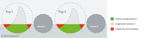 Durch den Einsatz eines Speichersystems ist es möglich, die ungenutzten Spitzen, die bei starker Sonneneinstrahlung entstehen können, in den Solarstromspeicher einzuspeisen.